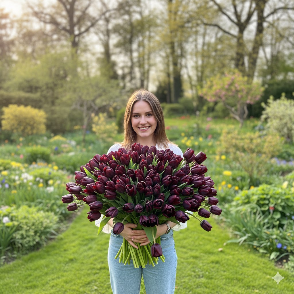 Тюльпан Queen of Night — справжня легенда серед весняних квітів, символ елегантності та загадкової краси. Його пелюстки мають глибокий, майже чорний відтінок з оксамитовим блиском, що на сонці переливається насиченим бордовим і фіолетовим сяйвом. Цей тюльпан виглядає настільки розкішно, що його часто називають «чорною перлиною саду». Він надає квітнику вишуканості, а у поєднанні з білими чи рожевими сортами створює вражаючий контраст, який неможливо забути.