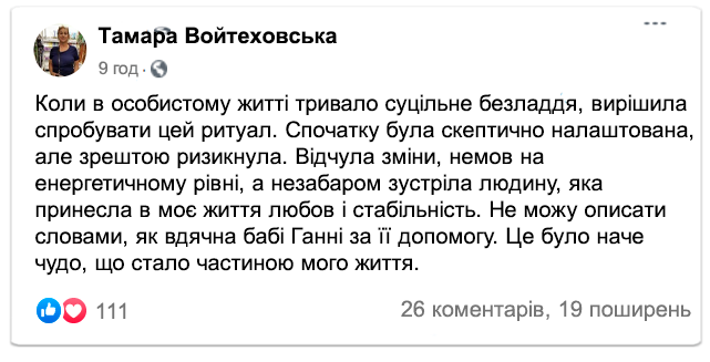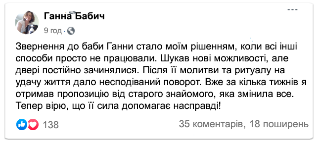 Зараз баба Ганна вже не може приймати всіх охочих особисто через вік і стан здоров'я. Тому вона продовжує допомагати людям онлайн, передаючи свої настанови та проводячи ритуали на удачу на відстані.